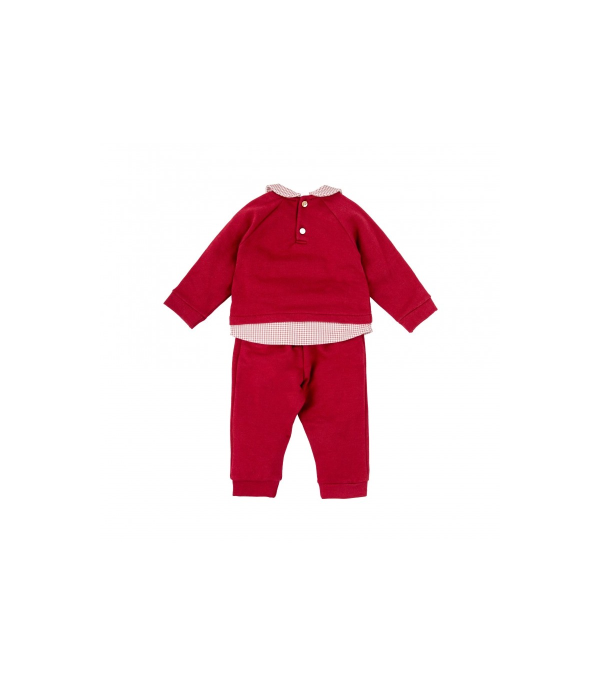 Conjunto de dos piezas para bebé en color burdeos es perfecto para los días más frescos. La sudadera, con cuello camisero en tejido vichy a juego con el dobladillo interior, está decorada con un divertido bordado de osito con corona, aportando un toque dulce y original. El pantalón largo a juego, en el mismo tono, completa un conjunto cómodo y cálido para el día a día. Ideal para bebés que combinan estilo y confort desde sus primeros meses.