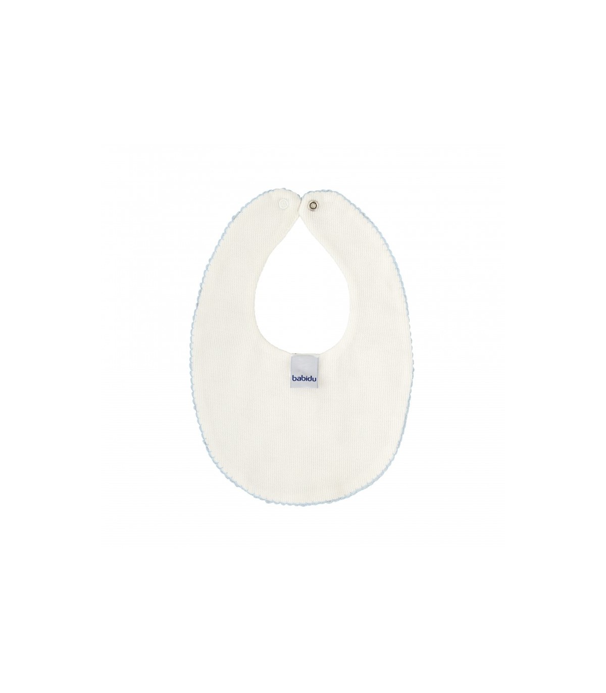 Babero ovalado para bebé con dulce estampado de conejitos sobre fondo crudo. Rematado con un delicado ribete en hilo celeste que aporta un acabado cuidado y encantador. Práctico, suave y cómodo para el día a día.