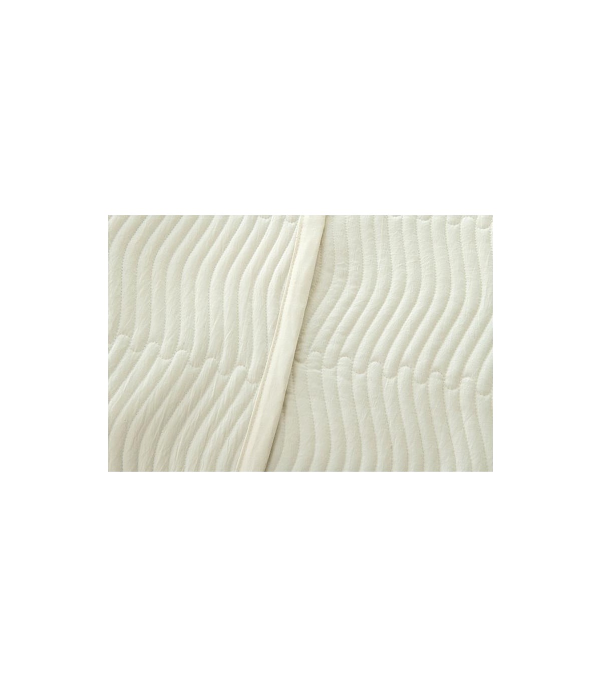 Conjunto de colcha dibujo de ondas, con volante perimetral y 2 cojínes a juego de 50X70. Guateada a sencillas ondas con un relleno ligero que le aporta relieve, su tejido lavado a la piedra un tacto muy suave y agradable. Este conjunto es ideal como colcha para entretiempo y verano. Todas las medidas incluyen dos fundas de cojín, el relleno de las fundas de cojín  está incluido.
