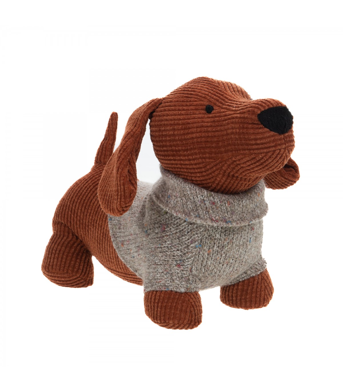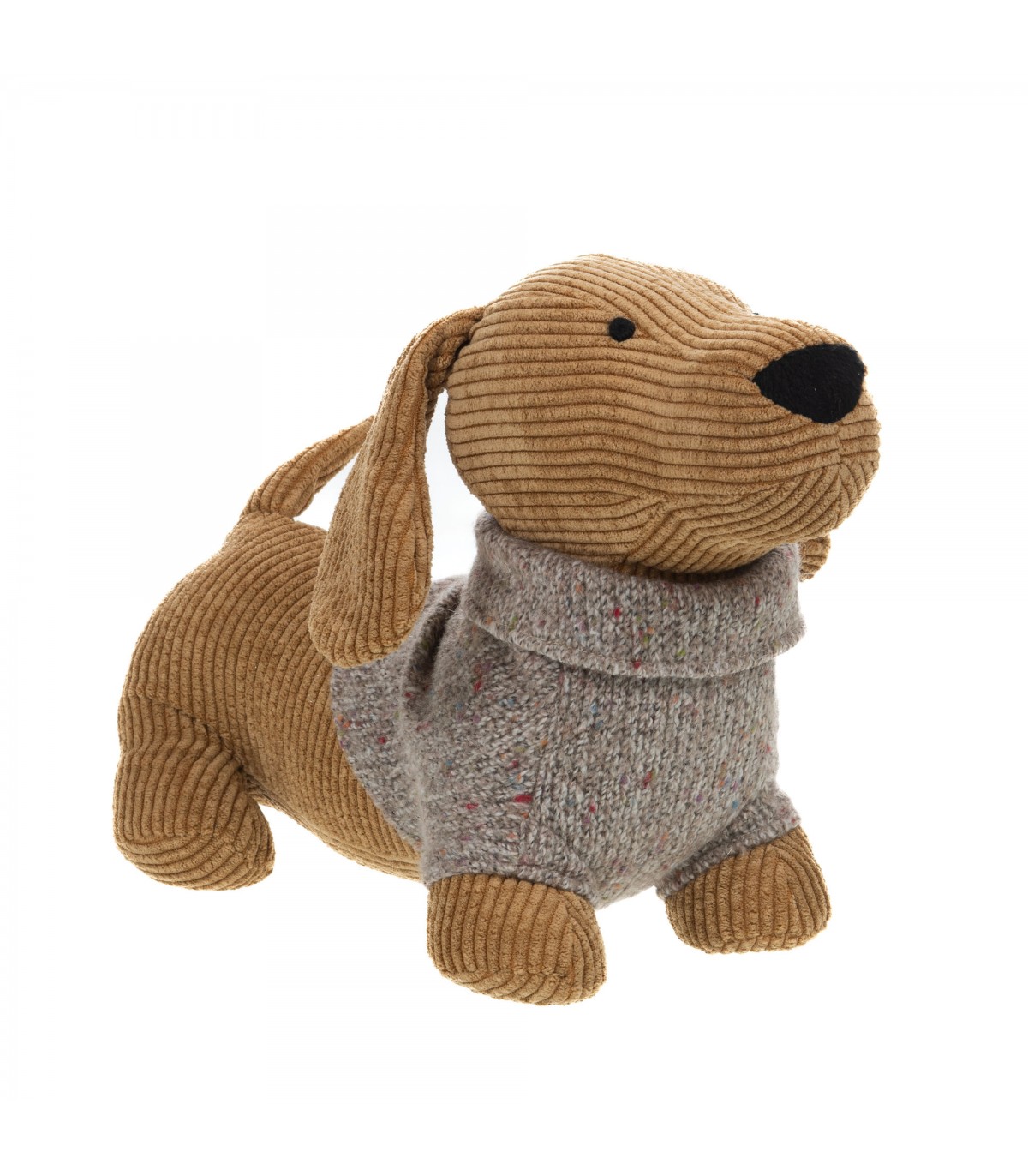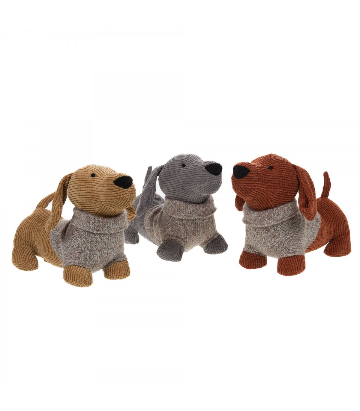 Tope de puerta en forma de perro de suave tela de terciopelo de corduroy terracota, completamente envuelto en poliéster al 100%. Compacto (30x16x23 cm) y ligero (1,05 kg), combina funcionalidad con un diseño lúdico para enriquecer una gama de accesorios para el hogar. Ideal para clientes que buscan productos prácticos con un estilo cálido y original, fácil de integrar en cualquier catálogo de decoración.