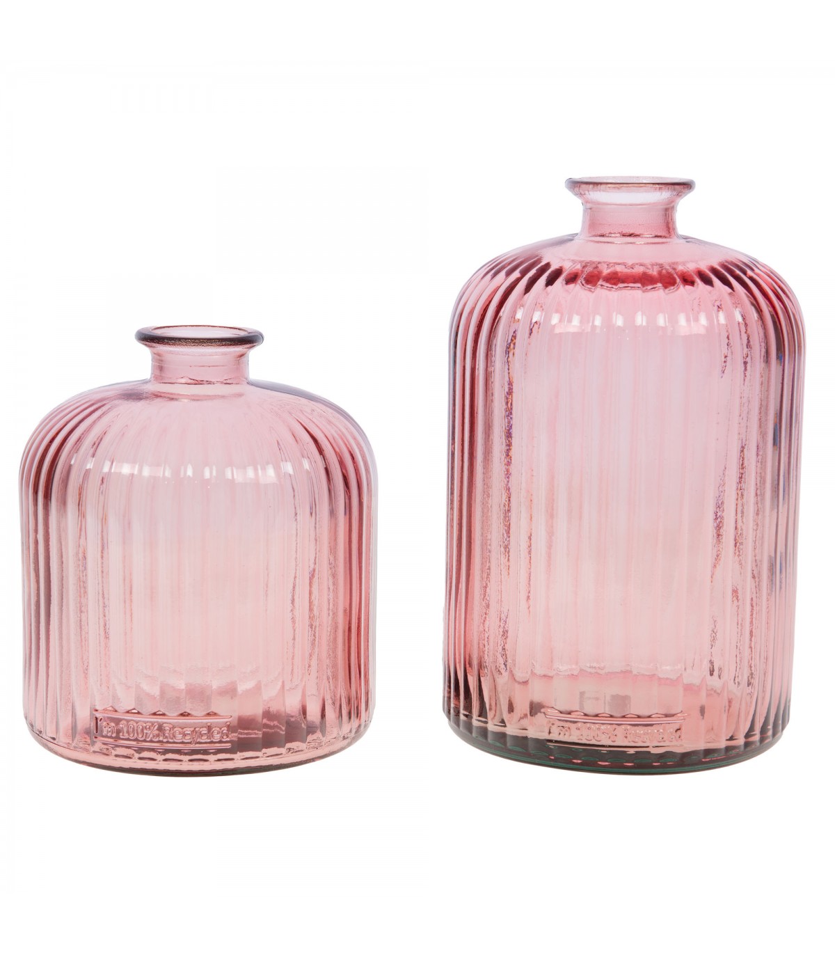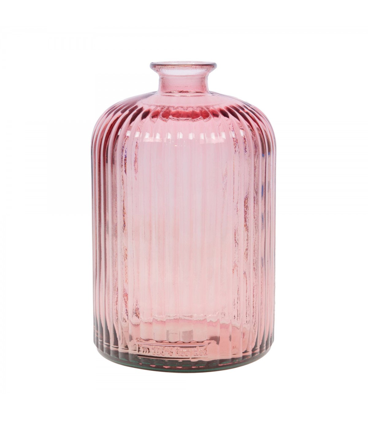 Jarrón de vidrio reciclado de 23 cm de altura, con una capacidad de 2800 ml, en un delicado color rosa. Su diseño estriado y su acabado translúcido aportan un toque elegante y ecológico a cualquier gama de decoración interior. Ligero (1190 g) y fácil de integrar en un catálogo de jarrones contemporáneos, atrae a una clientela que valora la estética y la sostenibilidad.