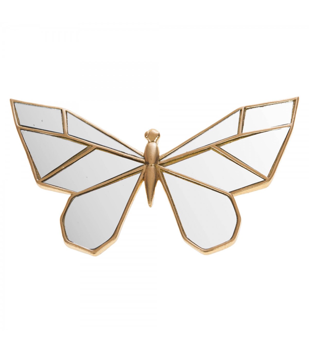 Espejo decorativo en forma de mariposa, que combina un diseño original con elegancia. El marco dorado estructura las alas en segmentos de espejo, ofreciendo un juego de reflejos y luz. Dimensiones compactas (27x16 cm) que facilitan su integración en diversos ambientes interiores. Producto ideal para enriquecer una gama de espejos decorativos de estilo contemporáneo y refinado.